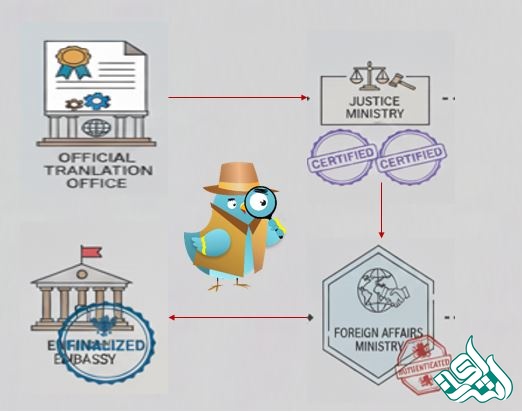 ترجمه اسناد و مدارک پس از دریافت مهر مترجم، دادگستری و وزارت امورخارجه میتواند مهر سفارت را دریافت نماید البته سفارت برخی کشورها مهر دادگستری و وزارت امور خارجه را به رسمیت نمیشناسند و ترجمه تنها بامهر مترجم را تایید مینمایند.