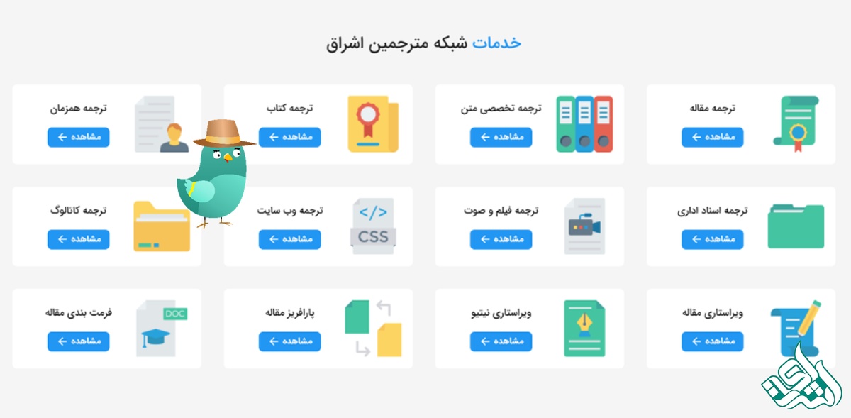 شبکه مترجمین اشراق نام برند معتبرترین و جامعترین وب سایتی است که خدمات منحصر به فرد ترجمه را بصورت آنلاین و براساس استاندارد های روز دنیا برای تمامی آحاد جامعه در تمامی رشتهها و گرایشها در 37 زبان زنده دنیا ارائه میدهد که تمام معیار ها از قبیل به کارگیری مترجمان زبده و متخصص بر اساس آزمون، تعدد خدمات ارائه شده، ارائه ترجمه به زبانهای گوناگون، گارانتی کیفی ترجمه، مترجم پیشنهادی از طرف کاربران، ارج نهادن به کاربران وفادار، پشتیباتی 24 ساعته در تمامی ایام، ازریابی کیفی توسط کارشناسان خبره شبکه، ارائه نمونه ترجمه و پرداخت قسطی، پرداخت جریمه برای ترجمههای با تاخیر را دارا می باشد.