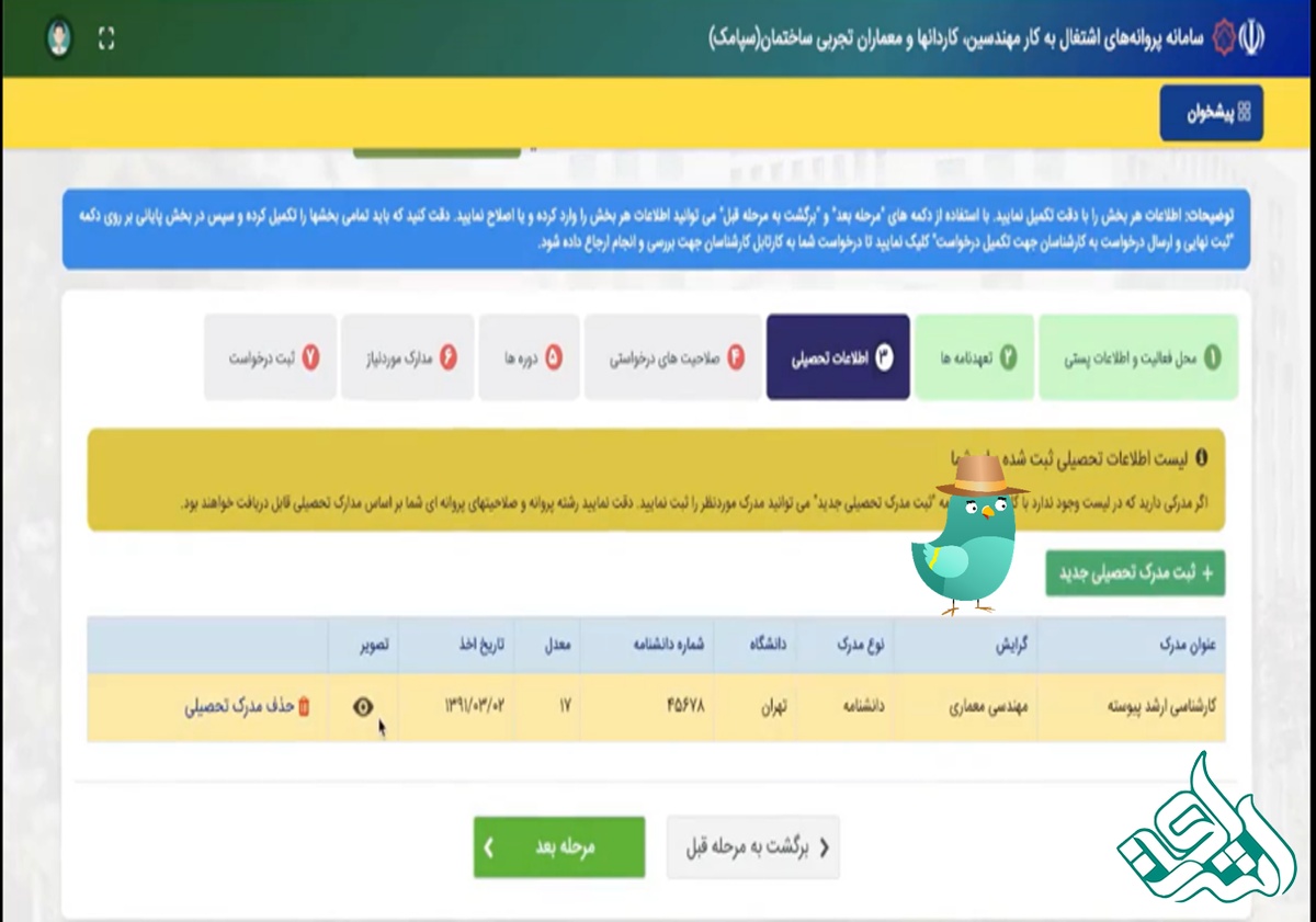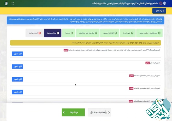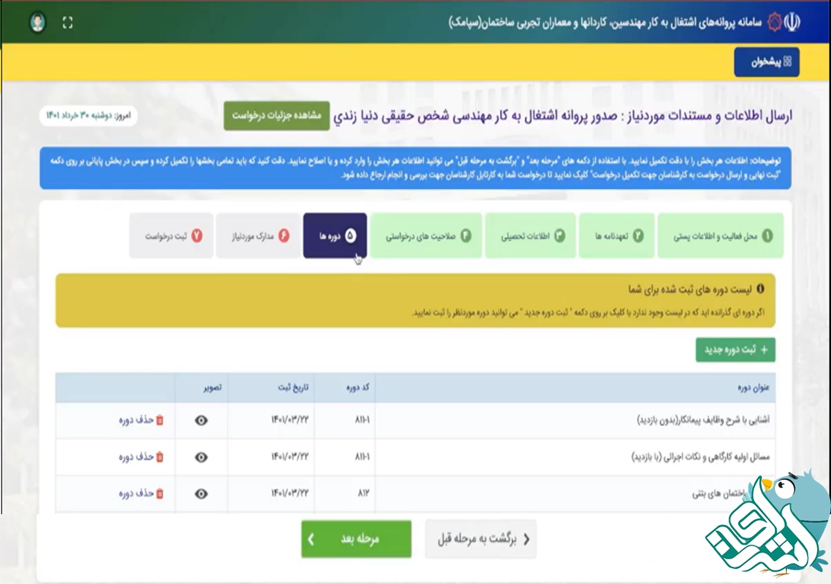 دوره ها: در این مرحله باید دوره های گذرانده شده بارگزاری شوند.
